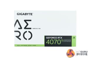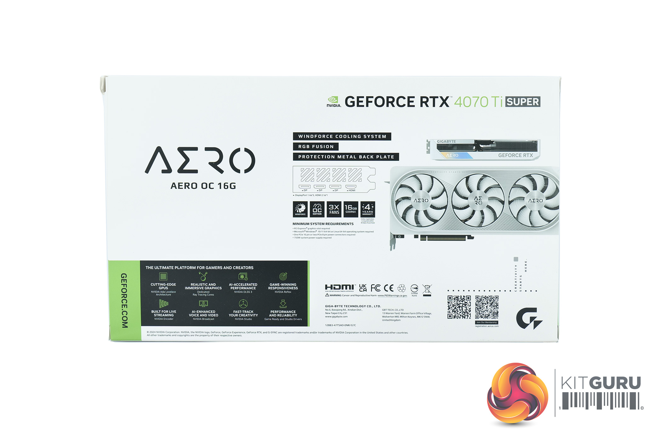 The Gigabyte RTX 4070 Ti Super Aero OC ships in a very clean white box, with just the Aero branding, alongside Gigabyte and GeForce logos visible on the front. On the back, Gigabyte highlights a few key features along with an image of the graphics card itself.