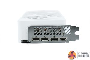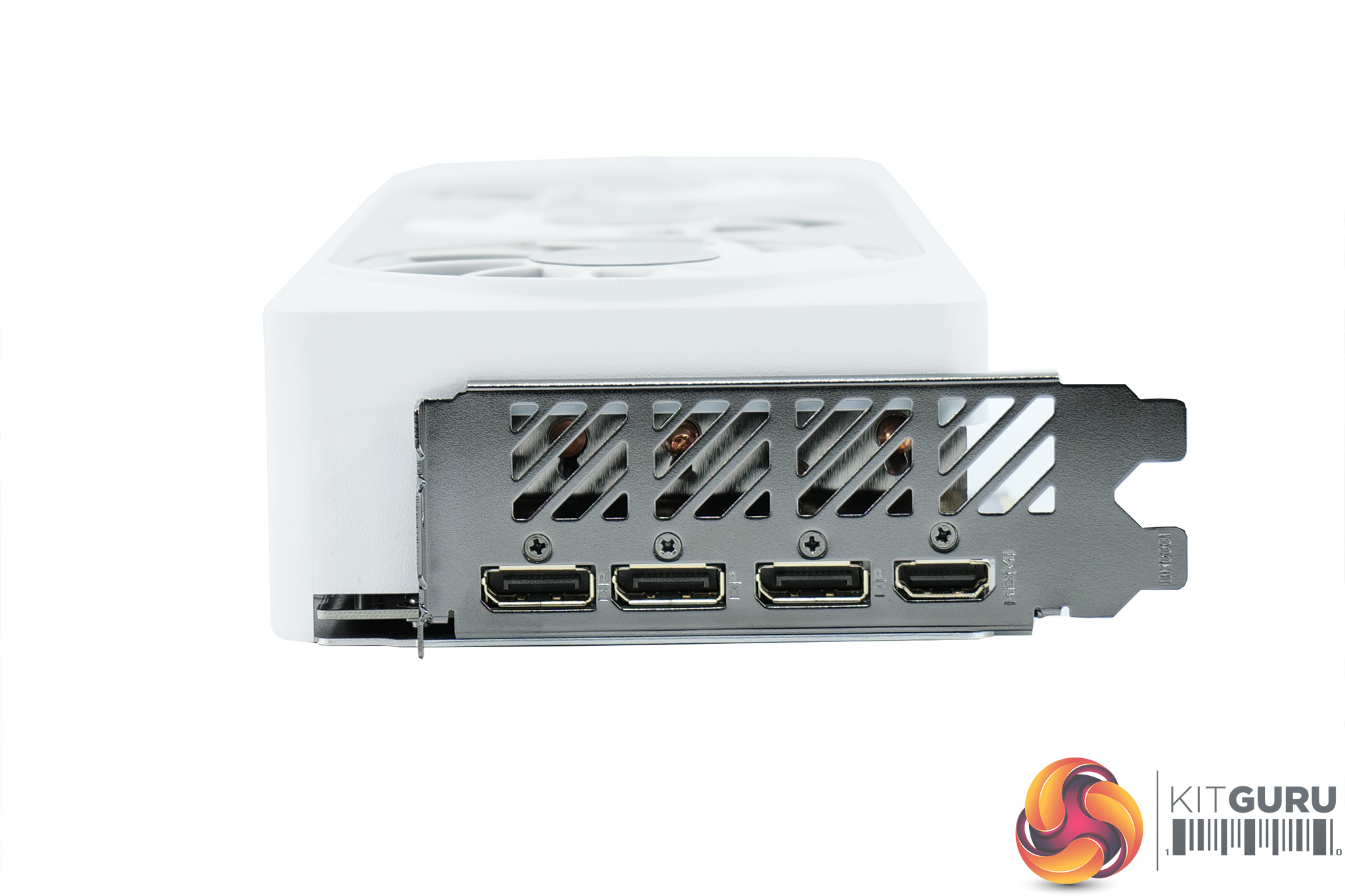 Power is supplied by a single 12VHPWR/PCIe Gen5 power connector, though a dual 8-pin adapter is included in the box. Display outputs are standard, with 3x DisplayPort 1.4 and 1x HDMI 2.1 connectors.