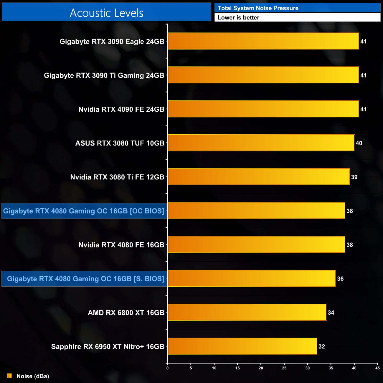 Speaking of noise, we have no complaints here either. The OC BIOS proved just as loud as the Founders Edition, hitting 38dBa on our sound meter, and the Silent BIOS improves things further by dropping fan speed by about 200rpm, reducing noise to 36dBa, which is very good going.