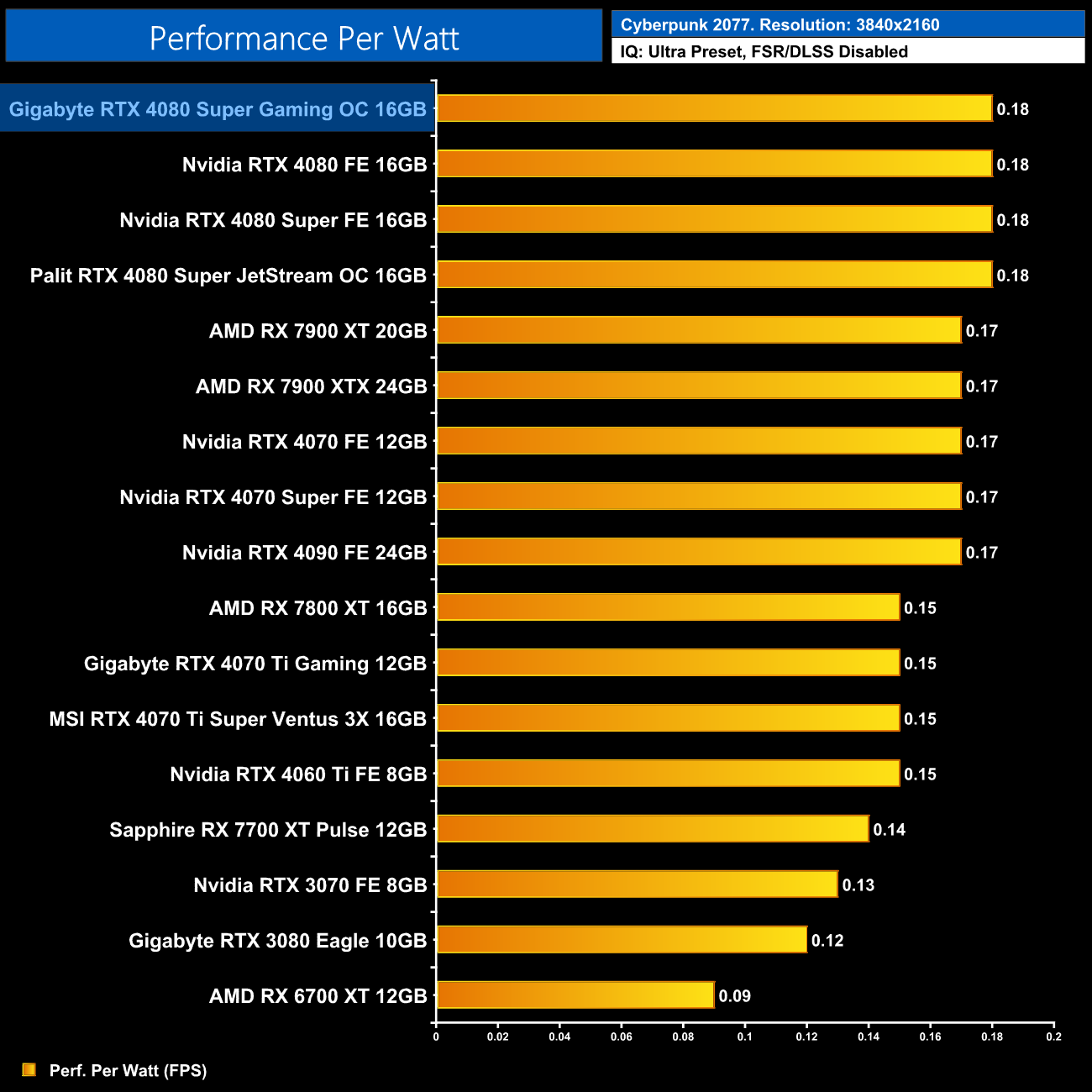 Combining the power draw values shown above with the performance data, we present performance per Watt for each graphics card tested: