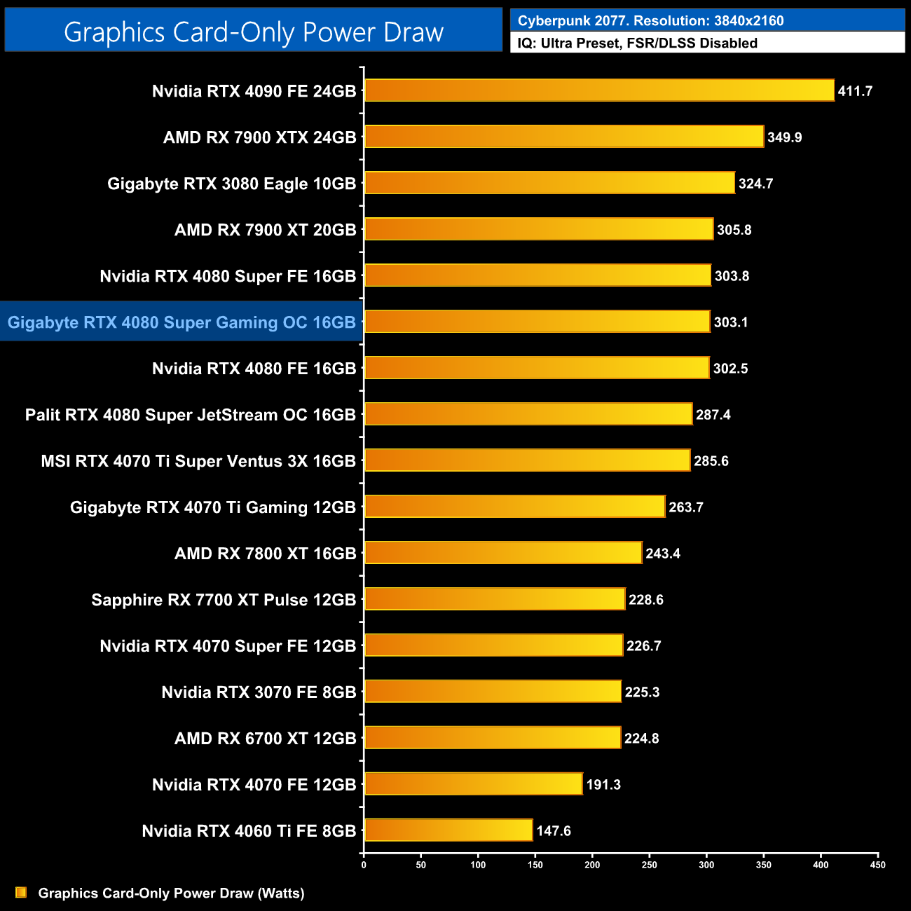 Given both the Gaming OC and Founders Edition share the same 320W TGP, it's not a surprise to see real-world power draw was basically identical between the two, hitting just over 300W in Cyberpunk 2077.