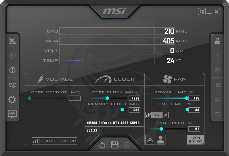 For our manual overclocking tests, we used MSI Afterburner. Our best results are as below.