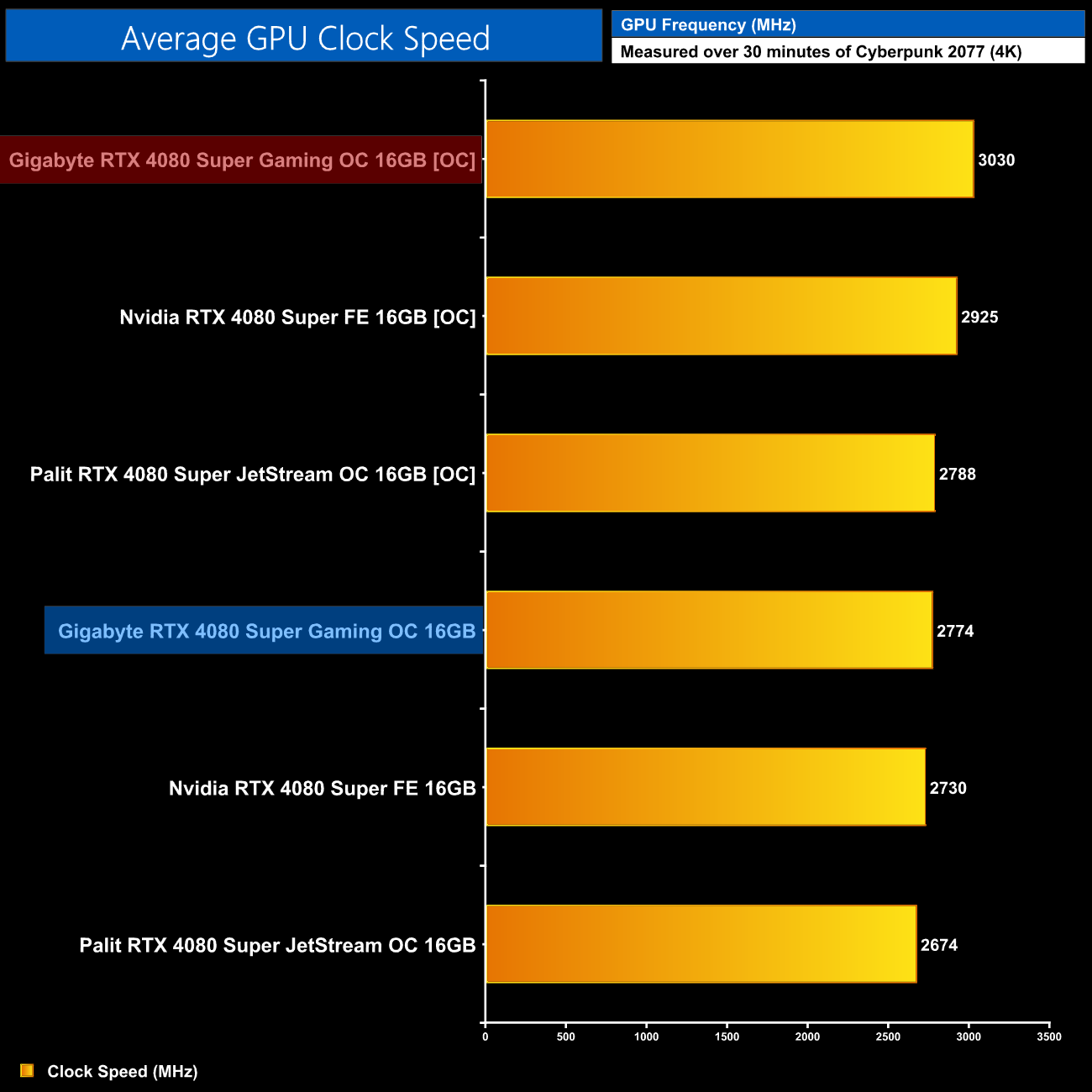 This brought average clock speeds up beyond 3GHz, remaining rock solid at 3030MHz over our 30-minute stress test in Cyberpunk 2077.