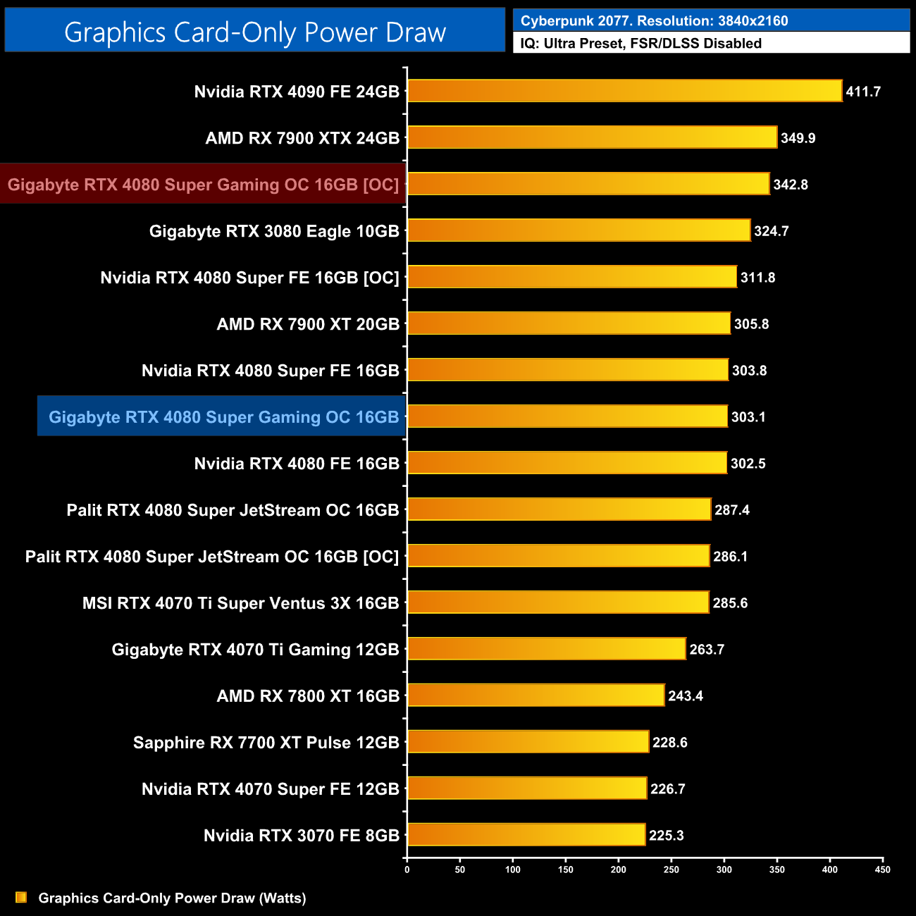 Power draw did increase by 40W or so when overclocked, which works out as an extra 13%, reducing efficiency slightly, but nothing too concerning.