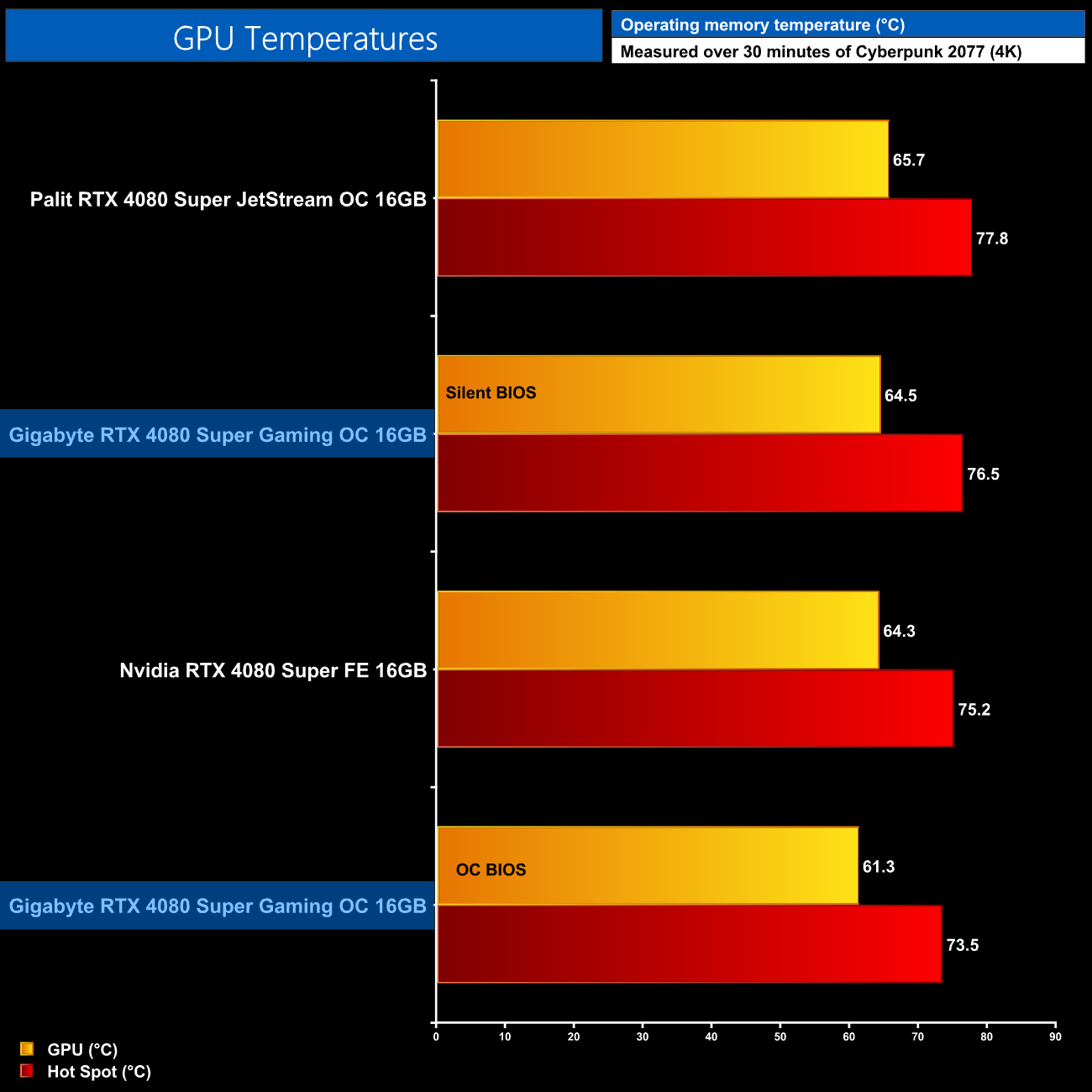 Thermal performance is a solid area for the Gaming OC. The OC BIOS ran the coolest of the three 4080 Supers we tested, not by a lot, but a peak GPU temperature of 61C is good to see. The Silent BIOS ran hotter due to its slower fan speed, but even then it was delivering very similar thermals to the 4080 Super FE.