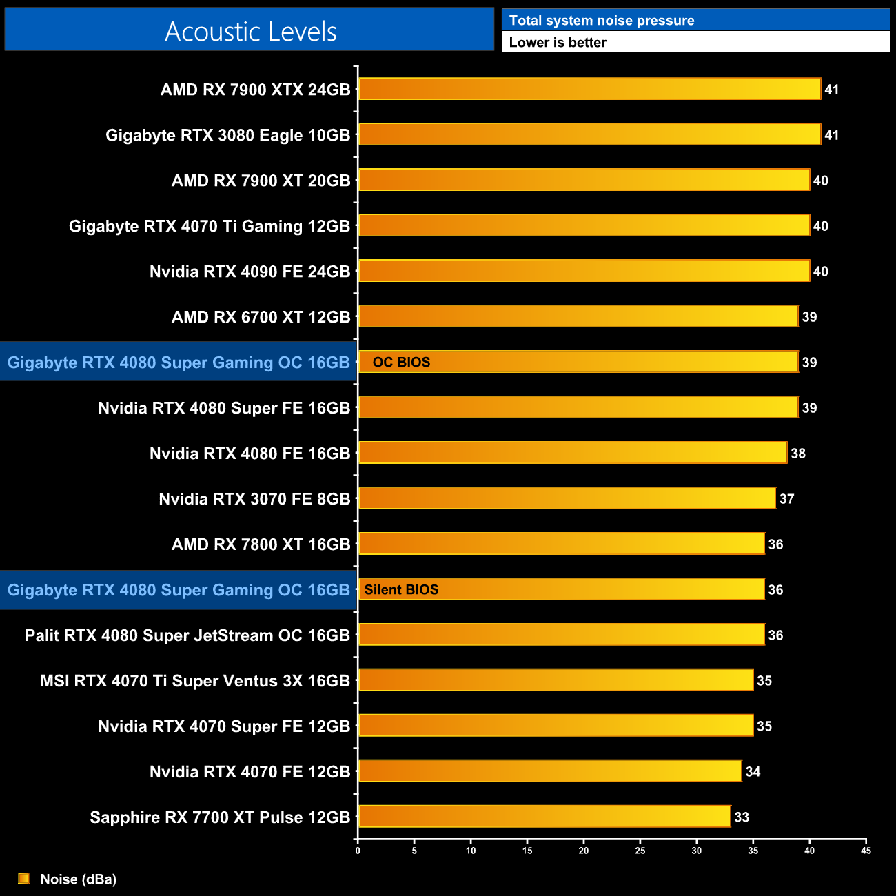 Of course, given the Gaming OC offers dual-BIOS functionality, you can choose between the OC or Silent modes. The former is a bit louder, with the fans running at 1650rpm, and while the Silent BIOS isn't quite silent, it is a good chunk quieter, running the fans at 1360rpm in my testing.