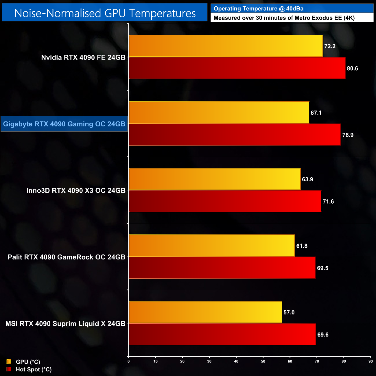 To operate at 40dBa, we set the fan speed to 1880rpm, and that saw the Gaming OC deliver results comfortably better than the Founders Edition, but a few degrees hotter than the Inno3D X3 OC and the GameRock OC. Even the hot spot temperature is only a couple of degrees cooler than the Founders Edition.