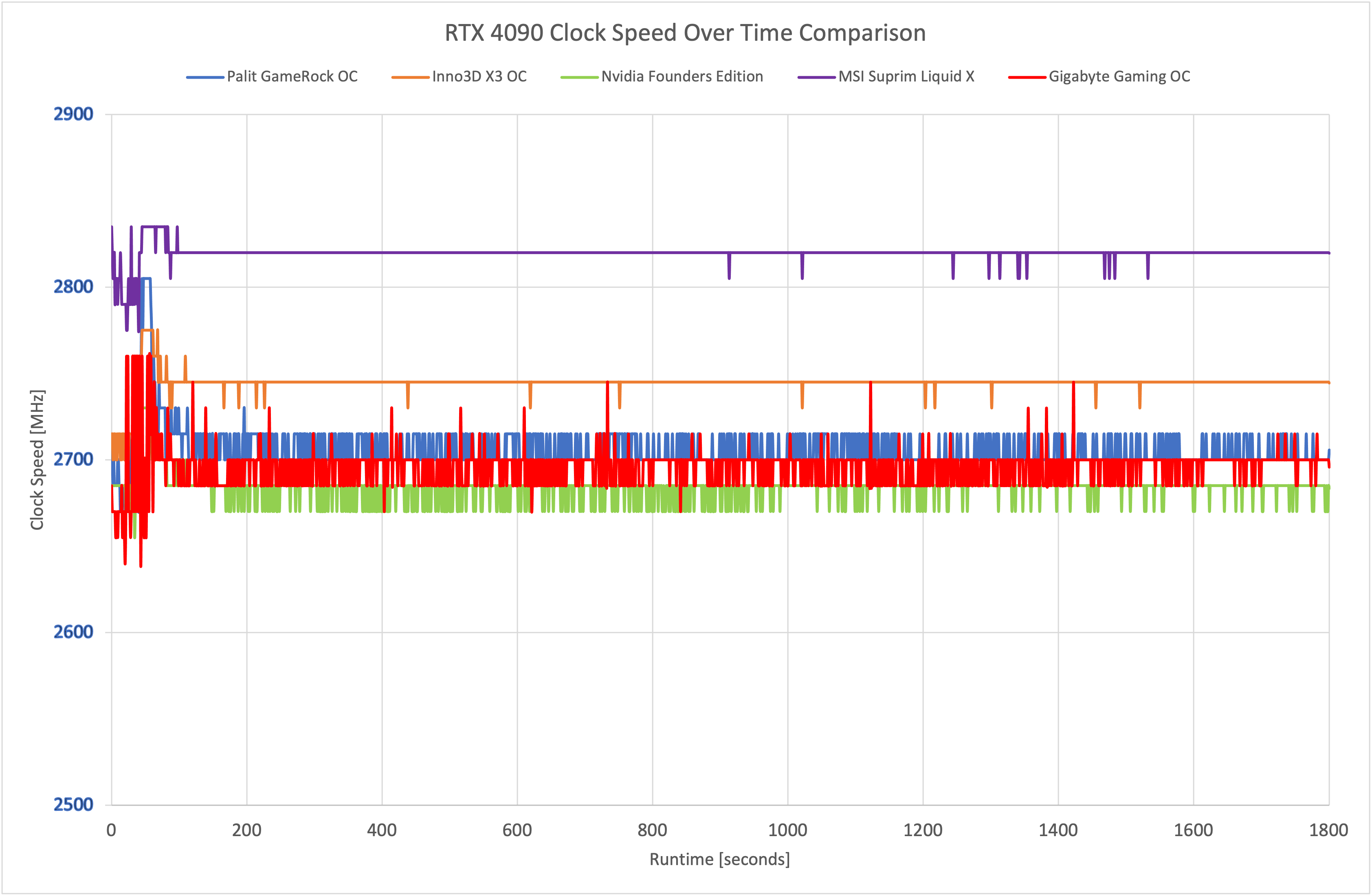 The reason we see such little difference in gaming performance is because the Gaming OC doesn't boost much higher than the Founders Edition at all. Over our thirty-minute stress test, it averaged 2696MHz using the default OC BIOS, and that's just a 13MHz gain over the Founders.