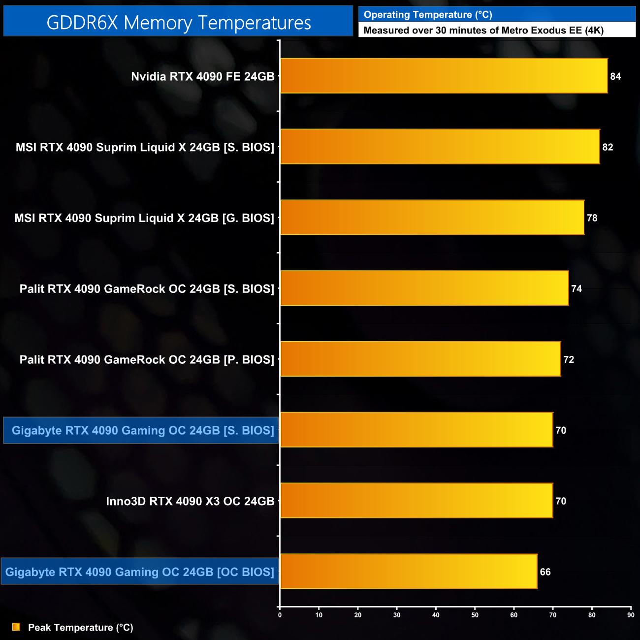 Memory thermals are a clear high point for the Gaming OC though, with the OC BIOS keeping the GDDR6X temperatures at just 66C, and that increased to 70C when using the Silent BIOS, which is the joint-second best result on the chart. Clearly, Gigabyte's heatsink and cooler has been designed with memory temperatures in mind.