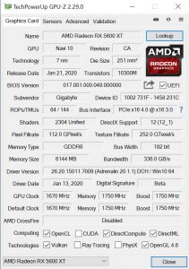 As with almost any RX 5600 XT that was available for the January 21st launch date, my Gigabyte Gaming OC shipped with the ‘old' BIOS, meaning the card ran at reference spec with a 150W power target, 1620MHz boost clock and 12Gbps memory. Gigabyte has released a public BIOS update to its website, updating the power limit to 180W, with boost clocks up to 1750MHz and memory now running at 14Gbps.