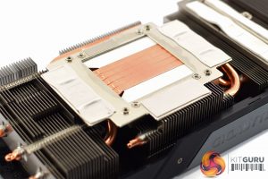 Finally, as for the cooler, this is comprised of three fin stacks, connected by a total of 5x 6mm copper heatpipes. These pipes make direct contact with the GPU die, while there is a separate plate for the VRAM and another for the VRM as well.