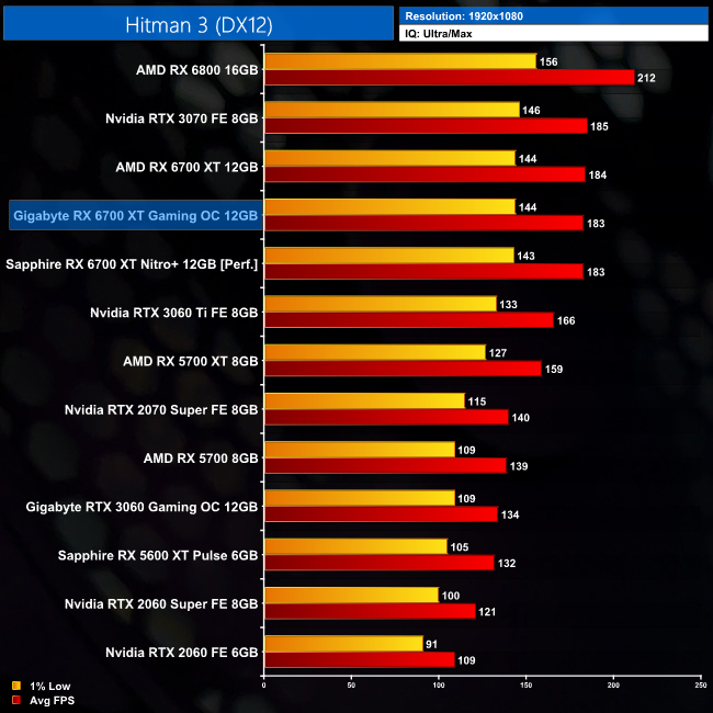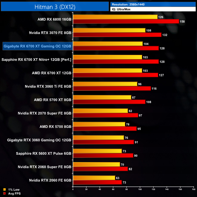 Delivering 128FPS on average in Hitman 3, at 1440p resolution, means the Gaming OC is exactly level with the Sapphire Nitro+, and just a single frame ahead of the reference card which is a negligible difference.