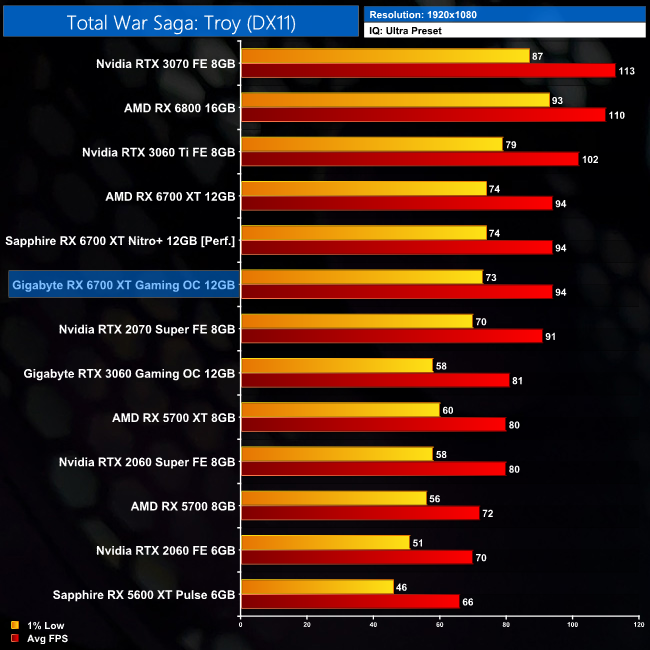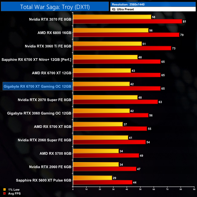Total War Saga: Troy is another title where we see no difference between the three RX 6700 XTs, as all three hit 65FPS on average at 1440p.