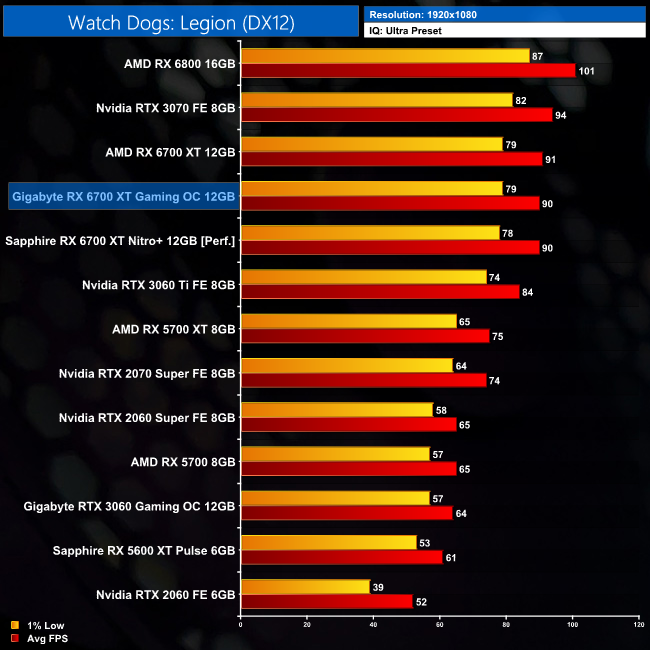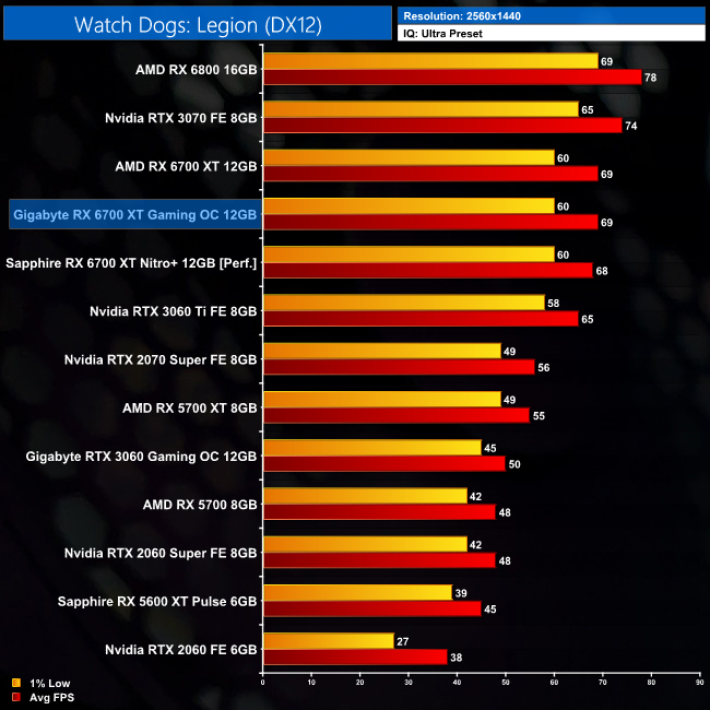 Finally we come to Watch Dogs: Legion. At 1440p, the Gaming OC averages 69FPS, which is exactly level with the AMD reference card and just a single frame faster than the Sapphire Nitro+.