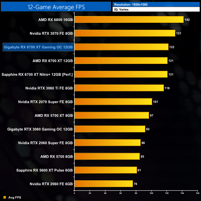 Averaged across the 12 games we tested, the Gigabyte RX 6700 XT Gaming OC is 1% faster than the reference card at both 1080p and 1440p. It's also 1% faster than the Nitro+ at 1080p, but there's no difference between the two at 1440p.