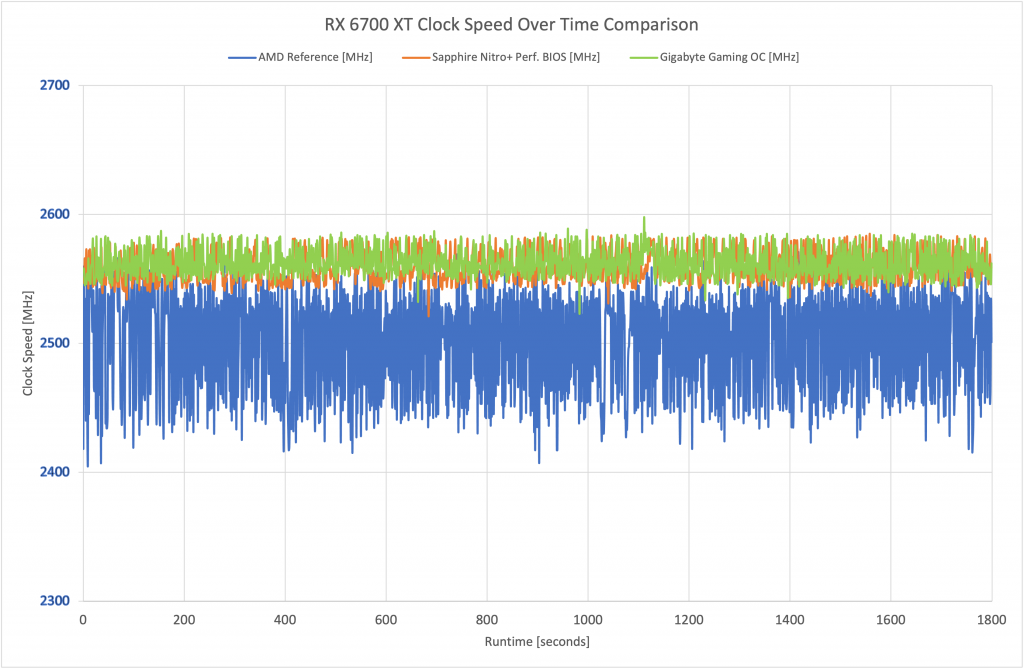 Looking at frequency behaviour of the RX 6700 XT Gaming OC, it is nearly identical to the Sapphire Nitro+. Averaged across the 30 minute stress test the Gaming OC ran just 3MHz faster, which is a negligible diference. Compared to the reference card, the Gaming OC is almost exactly 60MHz faster, but as we can see from the above scatter chart above, its frequency is significantly more stable, with much less variation in clock speed.