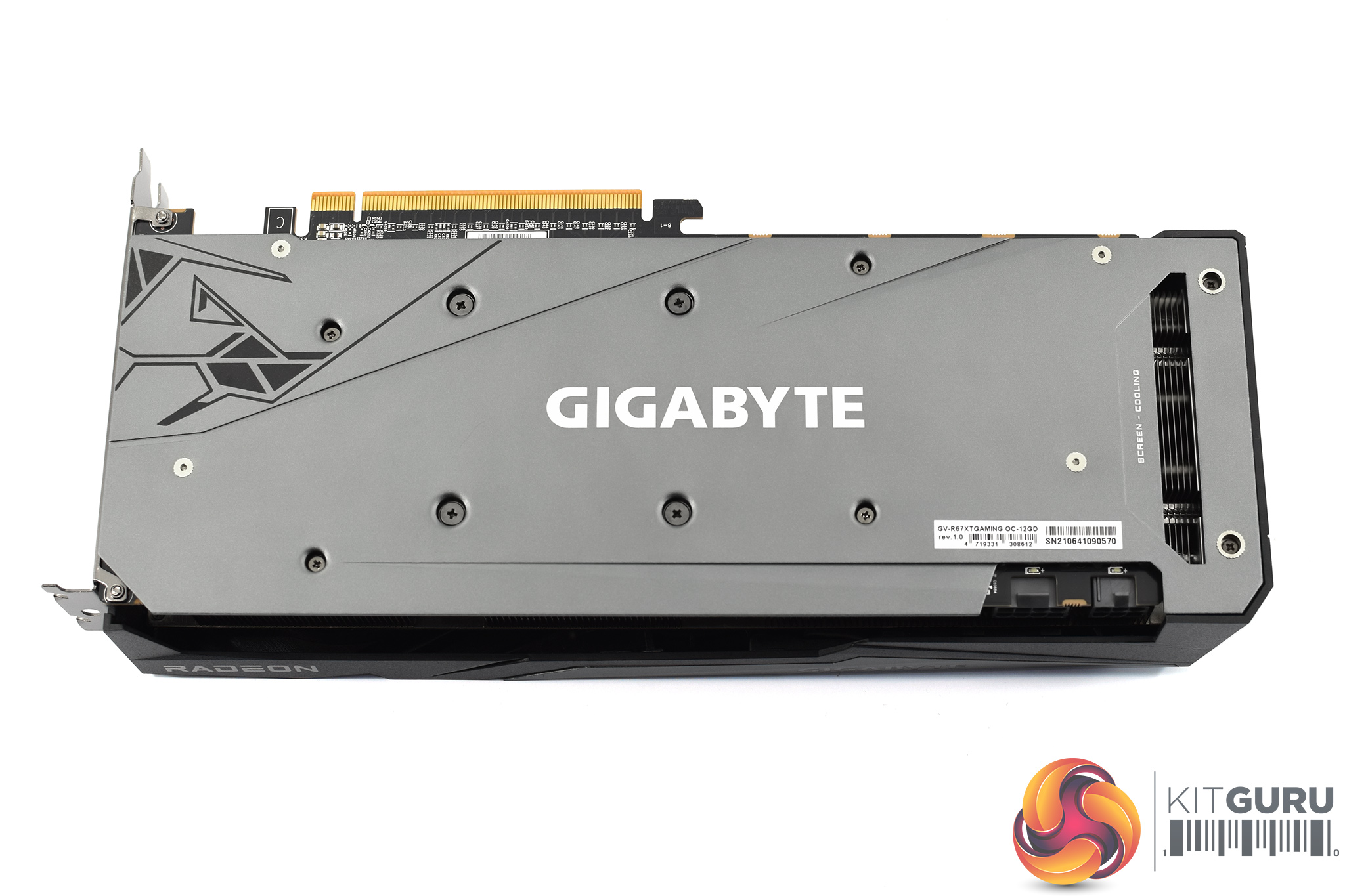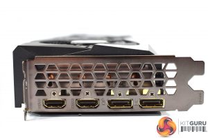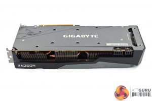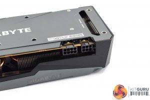 The backplate is a full-length metal design, with the Gigabyte logo printed in white. There is a tiny cut-out in the metal towards the end of the card, which Gigabyte calls ‘screen cooling', and it's designed to allow air to pass directly through the heatsink… but given how small the cut-out is, I'm not sure exactly how much it will accomplish!