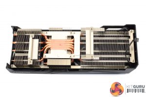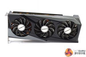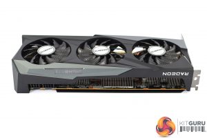 In terms of the fans, Gigabyte uses three 80mm fans, and as with all of its graphics card designs from the last couple of years, the central fan spins in reverse relative to the outer two, which Gigabyte claims helps to reduce airflow turbulence from the fans.