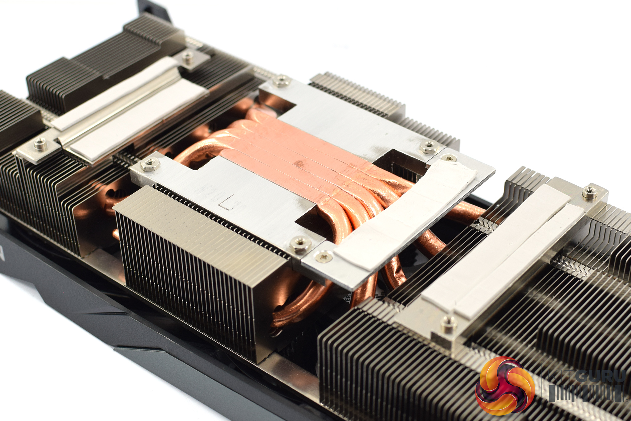 The heatsink is comprised of three fin stacks, connected by a total of 5x 6mm copper heatpipes. Unlike the RX 6900 XT Gaming OC, which uses a copper baseplate, here the heatpipes make direct contact with the GPU die. We can also see a variety of secondary plates used to contact the VRM and memory via thermal pads.