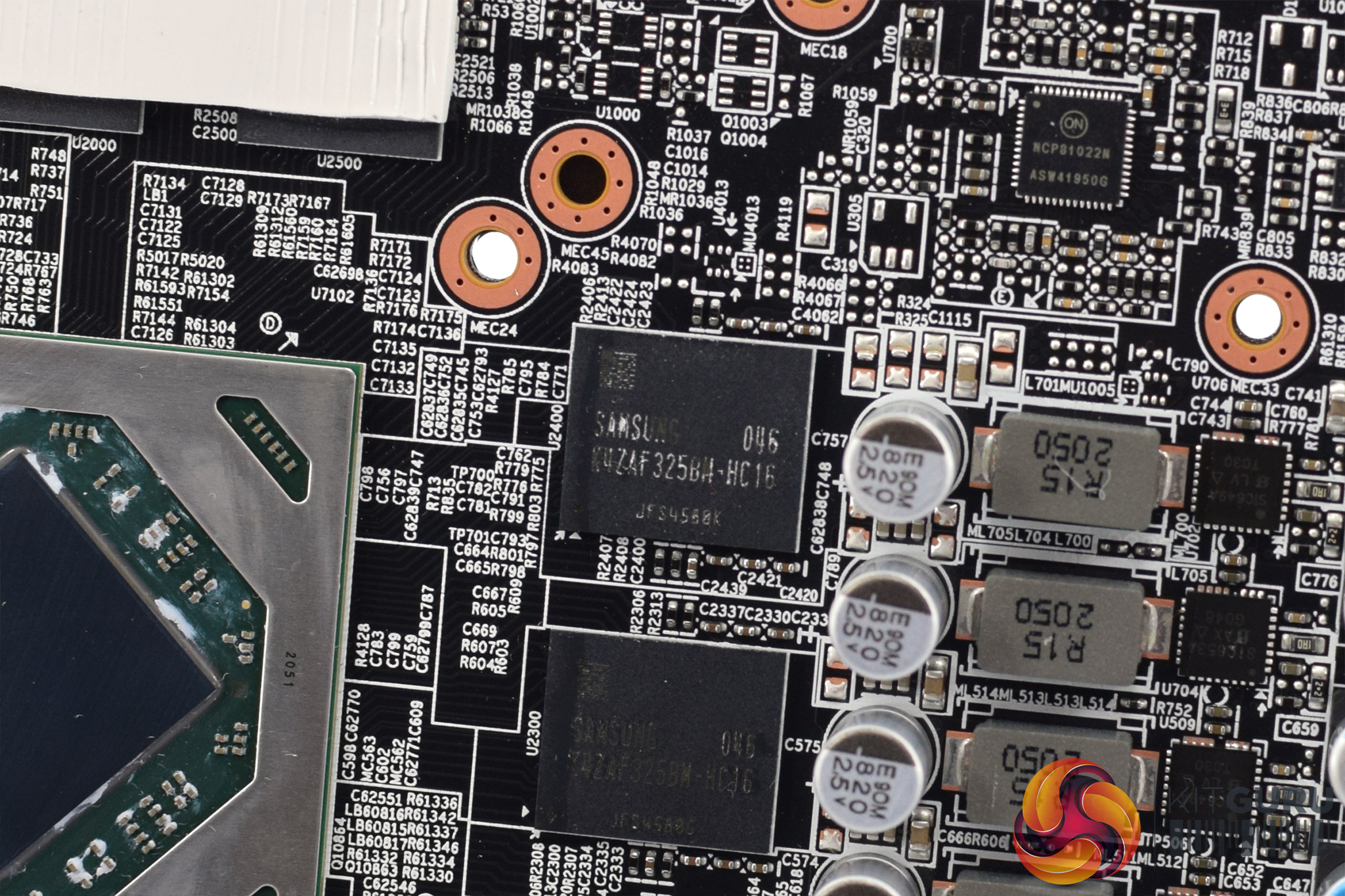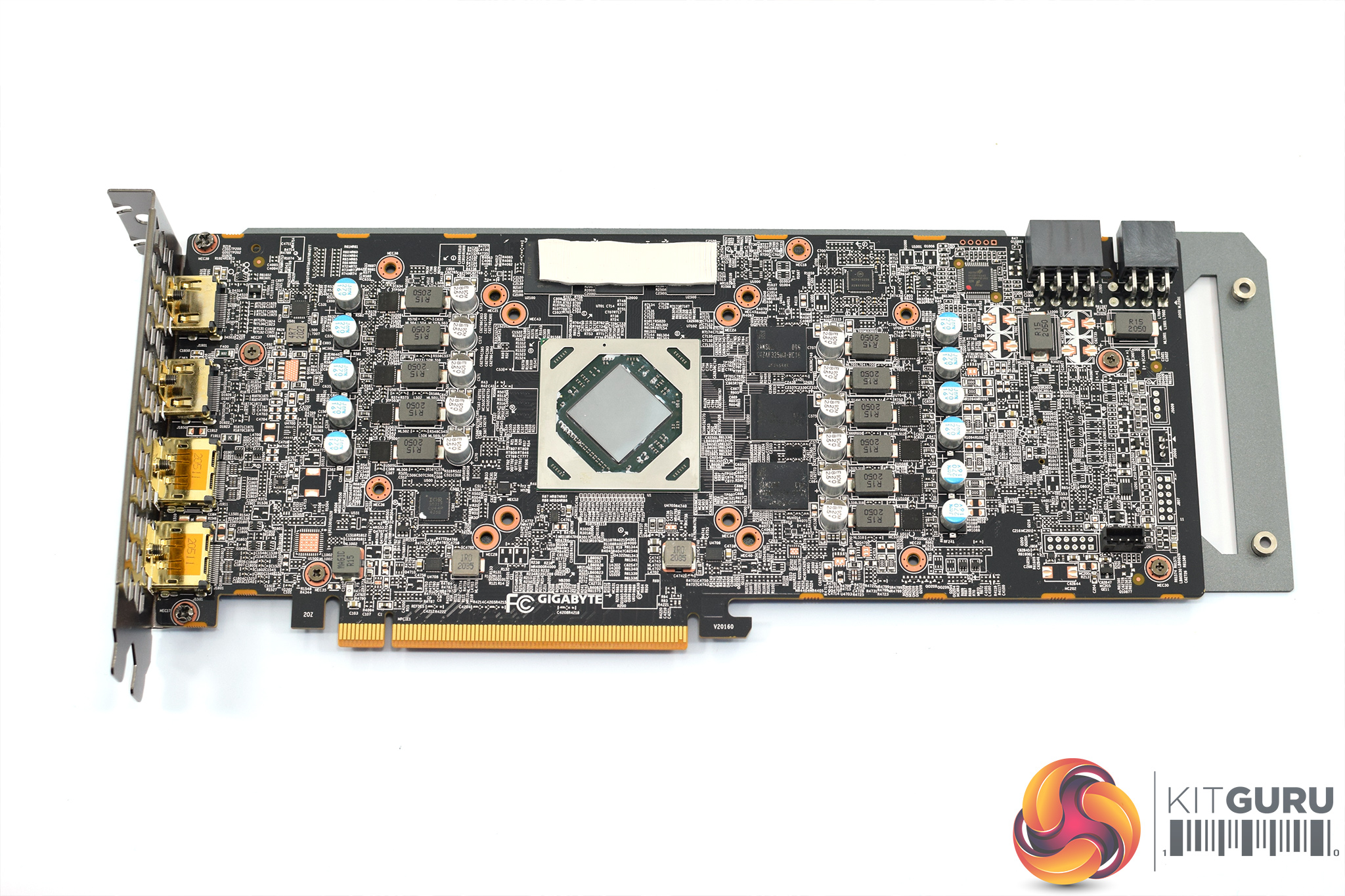 Upon disassembly of the card, we get a good look at the PCB. Gigabyte is using what appears to be a very similar design to the reference card, with an 11-phase power solution that's split with 9 phases for the GPU and 2 phases for the memory. The GPU VRM is controlled by International Rectifier’s IR35217, while the memory controller used is OnSemi’s NCP81022N. Vishay SIC653A and SIC649A MOSFETs are used throughout.