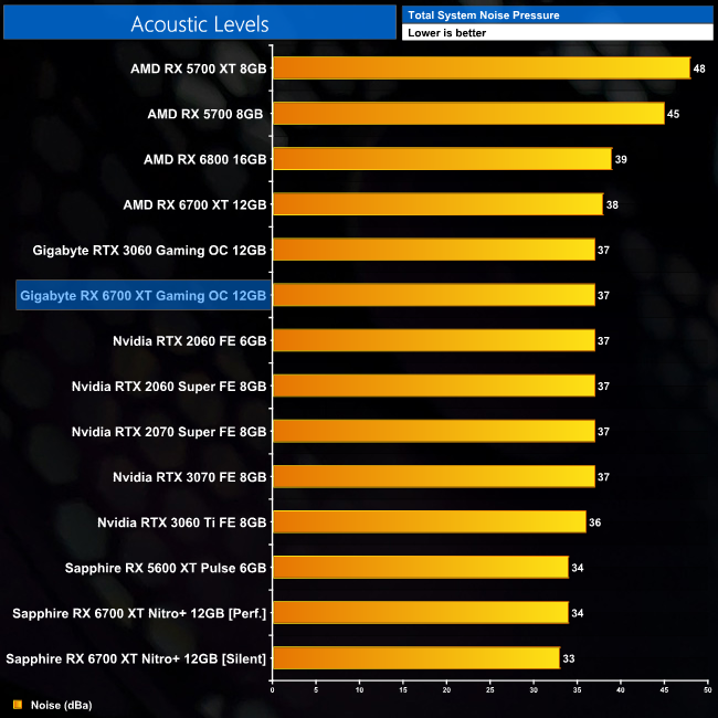 We take our noise measurements with the sound meter positioned 1 foot from the graphics card. I measured the noise floor to be 32 dBA, thus anything above this level can be attributed to the graphics cards. The power supply is passive for the entire power output range we tested all graphics cards in, while all CPU and system fans were disabled. A reading under load comes from running Cyberpunk 2077 for 30 minutes.