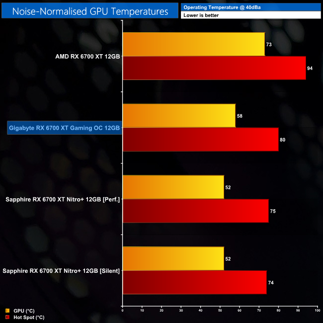 Following on from our stock thermal and acoustic testing, here we re-test the operating temperature of the GPU, but with noise levels normalised to 40dBa. This allows us to measure the efficiency of the overall cooling solution as varying noise levels as a result of more aggressive fan curves are no longer a factor.