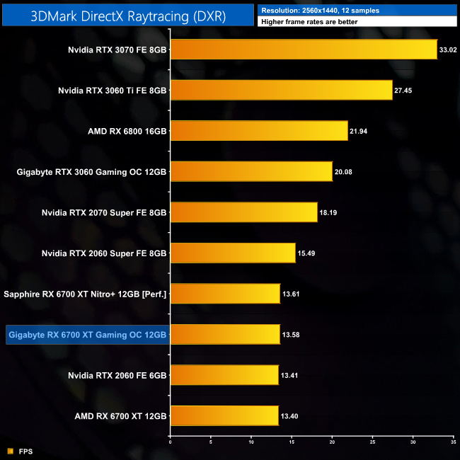 3DMark's DXR feature test paints a difficult picture for the RX 6700 XT, with the Gaming OC barely outperforming Nvidia's RTX 2060. It's 1% faster than the reference 6700 XT, while there's just 0.02FPS separating the Gaming OC and the Nitro+.