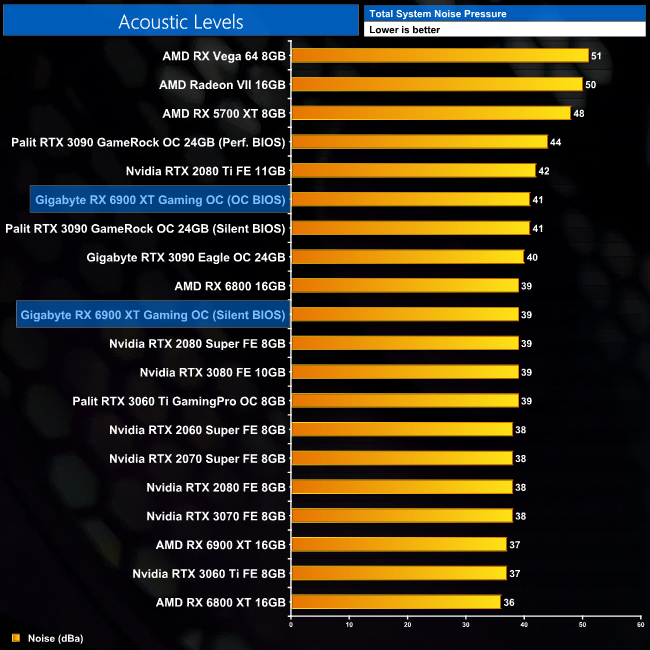 Interestingly, Gigabyte's Gaming OC is a little louder than the reference card. Not by a whole lot, but the Silent BIOS is 2dBa louder, while the OC BIOS is 4dBa louder. In our testing, the Silent BIOS saw the fans run at 57%, or 1790rpm, while the OC BIOS ramped things up to 62%, or 1950rpm. Contrast that with the three fans on the reference card, which spin at around 1450rpm, and it's not hard to see why the Gaming OC is a little louder.