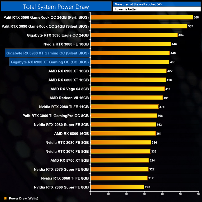 For graphics card-only power draw, both BIOS modes clearly have the exact same power target, which is why clock speed behaviour is identical between the two – the only difference is the default fan curve. Compared to the reference card, power has only increased by 16W which is hardly a significant change. Considering this card has three 8-pin connectors, I was hoping that at least the OC BIOS would really push up the power and enable higher clock speeds, but that isn't the approach Gigabyte has taken.