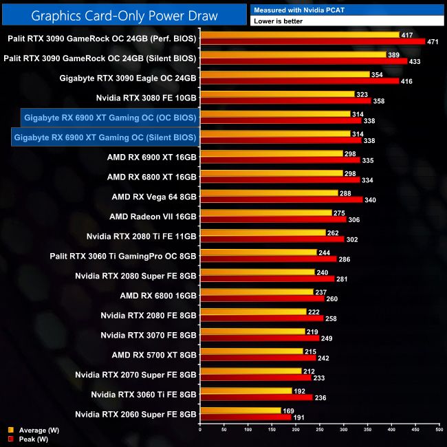 We also use Nvidia PCAT to measure power draw of the graphics card only, with readings from both the PCIe slot and the PCIe power cables combined into a single figure. This provides us with significantly more accurate data to work with as it is measuring only the GPU power, and not total system power which is a fundamentally imprecise measurement.