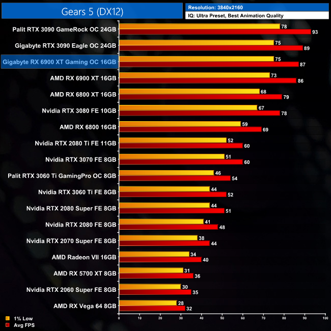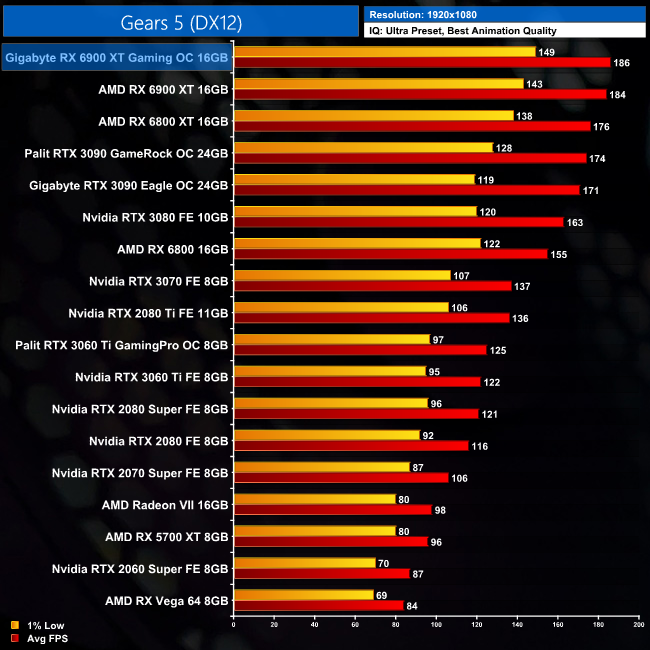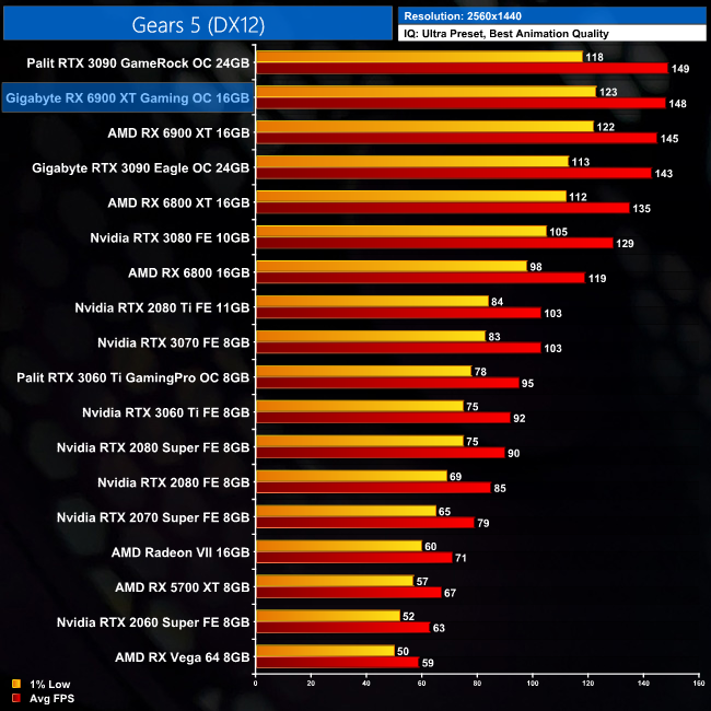 Coming now to Gears 5, here it is more of the same, with the Gaming OC seeing small gains over AMD's reference card. It is 2% faster at 1440p, for instance, then just 1% faster at 4K.