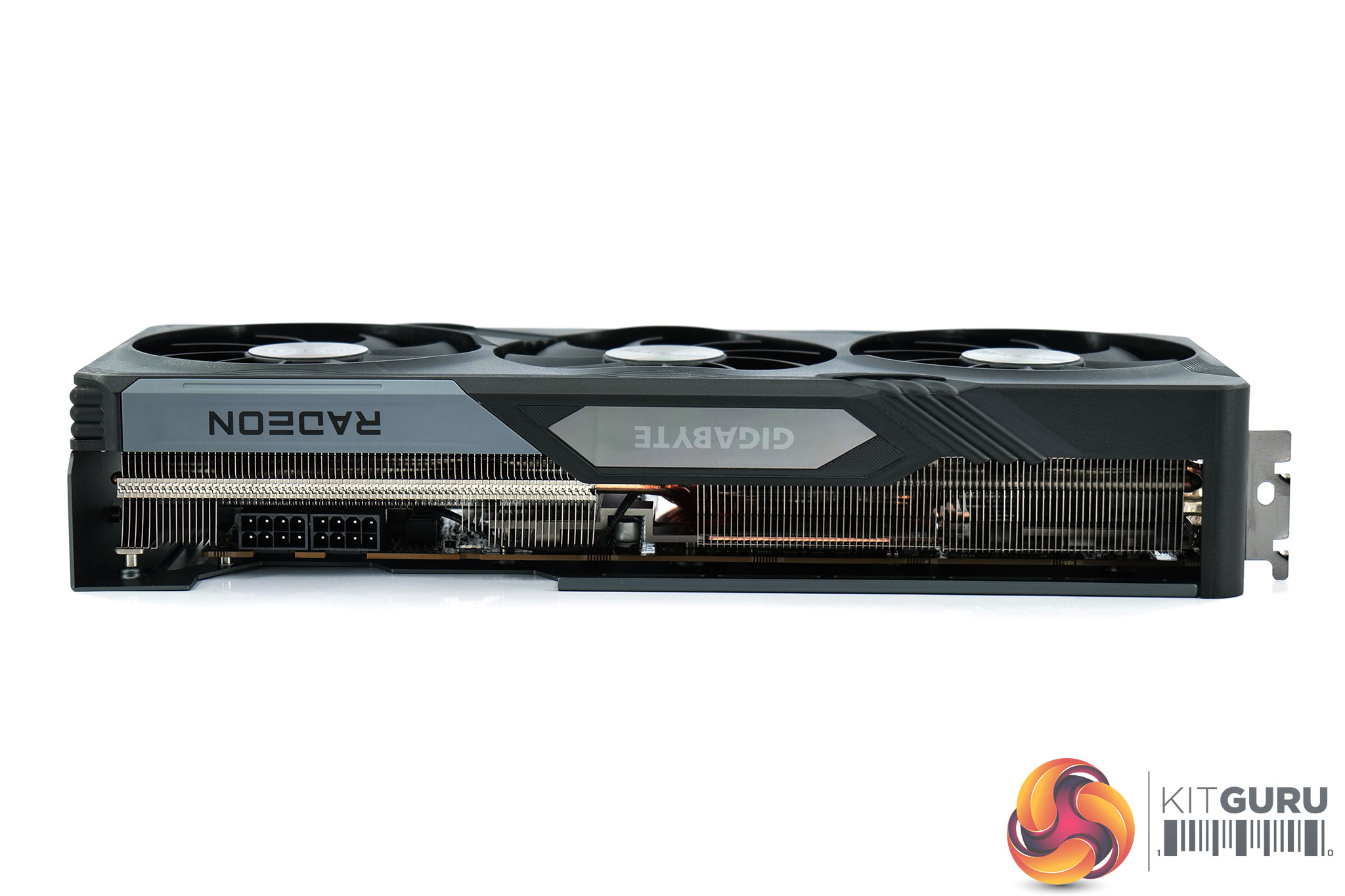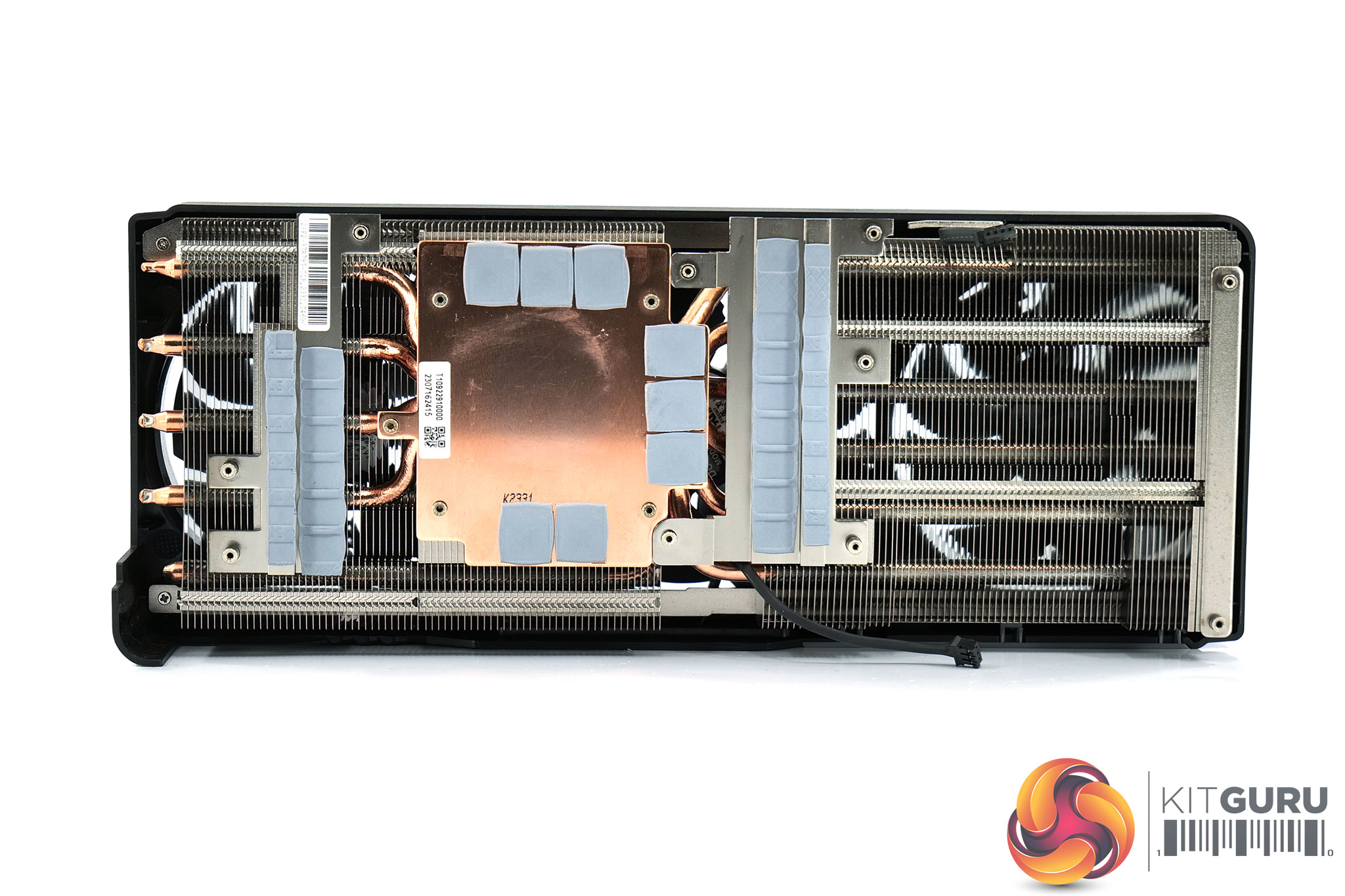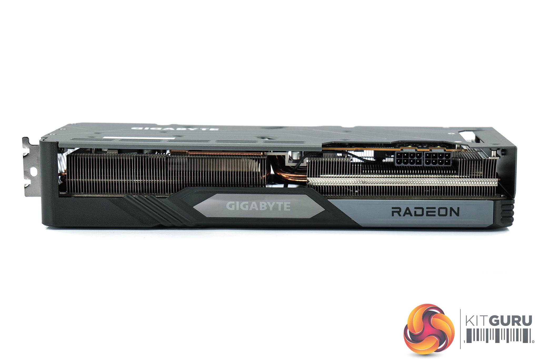 For the cooler, Gigabyte has deployed two aluminium finstacks, connected by a total of 7x 6mm copper heatpipes. The GPU and memory make contact with a copper baseplate, while there are some smaller secondary baseplates used to cool the VRM.