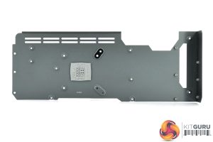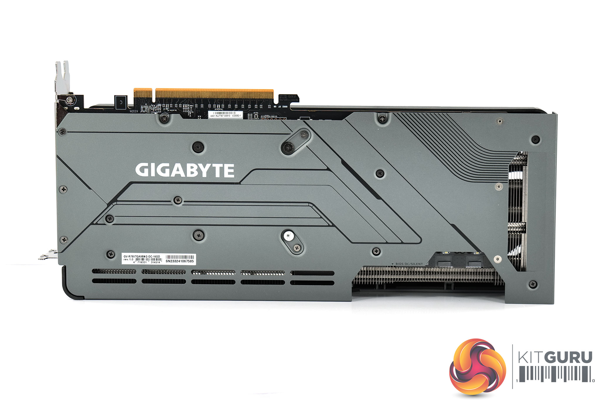 Flipping over to the backplate, this is a full-length design that is made of a grey metal. We can see the Gigabyte logo printed in white, while there is a very small cut-out right at the end of the card to allow some air to pass straight out of the heatsink – but as this is so small, I'm not sure it will do a whole lot for cooling.