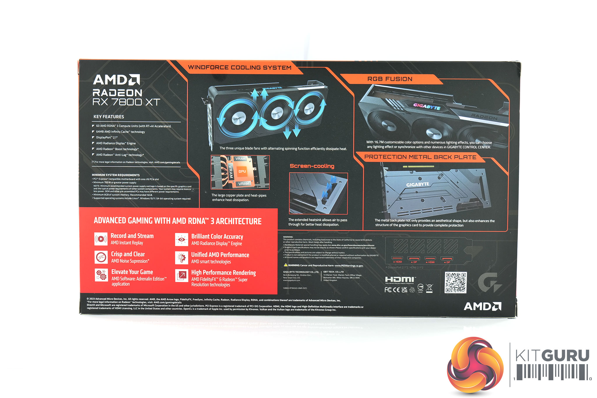 The Gigabyte RX 7800 XT Gaming OC ships in a black box, with a futuristic-looking image of some sort of cyber soldier on the front. On the back, the company highlights a few key features of the card and the Windforce cooler.