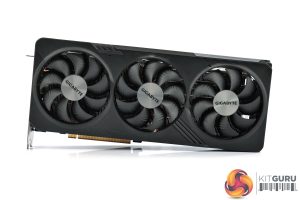 The front side of the card is home to a glossy plastic section, with the Gigabyte logo housed within it acting as the only RGB zone on the card. This uses a rainbow-style effect out of the box but can be configured using Gigabyte Control Center software.
