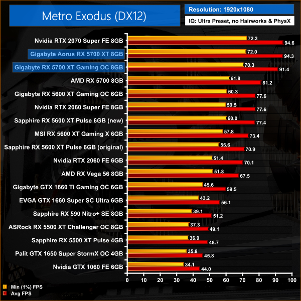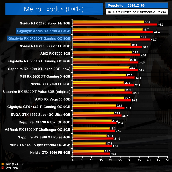 As for Metro Exodus, this title is a bit more consistent when directly comparing the two 5700 XTs. At 1080p for instance, the Aorus is 3% faster than the Gaming OC, while at 1440p the difference between the two is 4%. At that resolution, the Aorus is going toe-to-toe with the 2070 Super, but the Gaming OC is 4% slower.