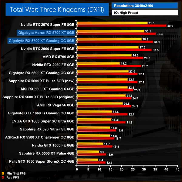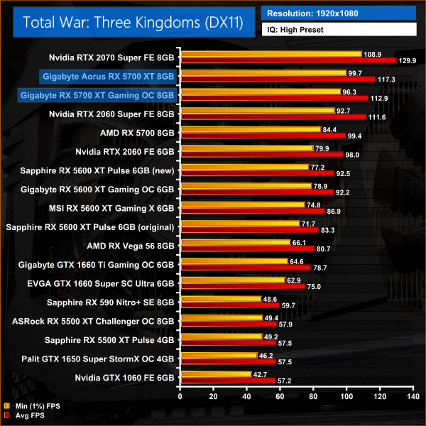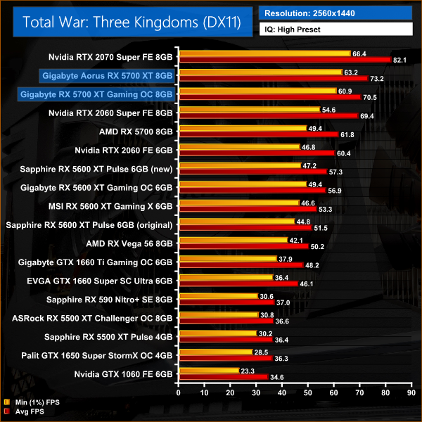 Finally we come to Total War: Three Kingdoms. This game scaled well with increased clock speed, as the Aorus 5600 XT comes in 4% faster than the Gaming OC across every resolution tested. This still isn't enough to match the RTX 2070 Super, but where the Gaming OC is 14% slower than the 2070 Super at 1440p, the Aorus is 11% slower instead.