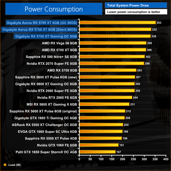 Lastly we come to power draw. It's no surprise to see the Aorus 5700 XT using its OC BIOS pulling the most power, at over 350w for total system power draw in our testing. Switching to the Silent BIOS dropped power consumption by about 20W, which incidentally was almost identical to that of the Gaming OC. Considering the extra clock speed both cards offer over the reference design, I'd say these results are as expected.