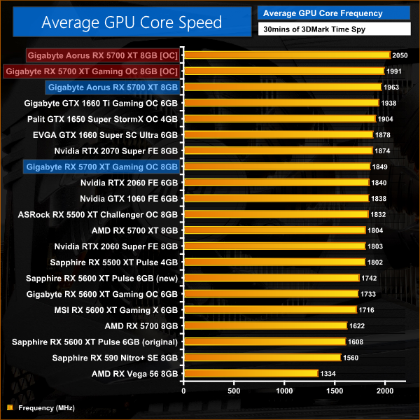This saw the Aorus run about 60MHz faster in our average clock speed testing as it hit 2050MHz. The Gaming OC came in just shy of that 2GHz mark.