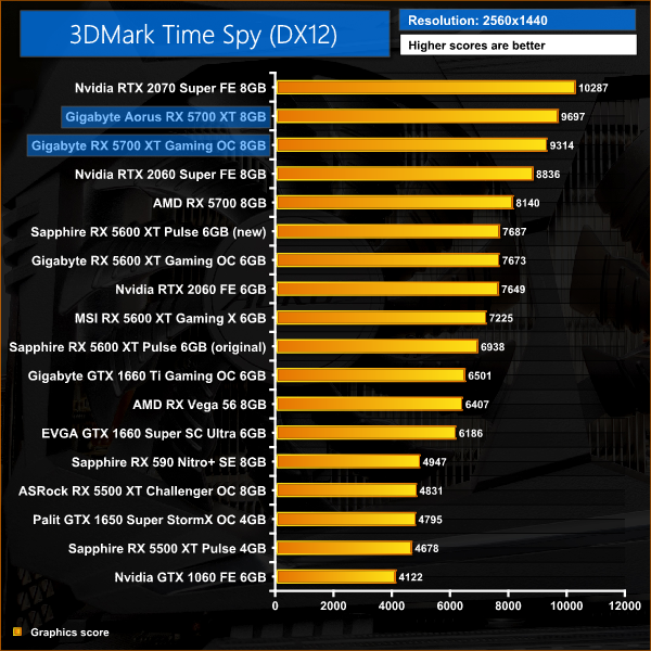 Our 3DMark scores give a slight indication about what we can expect from our games testing today – the Aorus produces scores which are 4% higher than the Gaming OC across all three 3DMark tests. Both cards beat the RTX 2070 Super in Fire Strike and Fire Strike Ultra, but fall behind the Nvidia GPU in the DX12 Time Spy test.