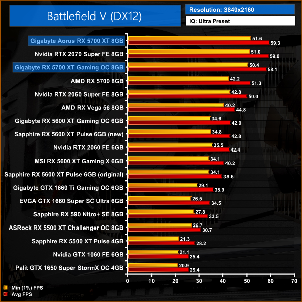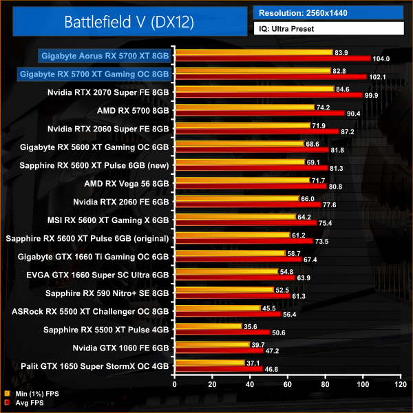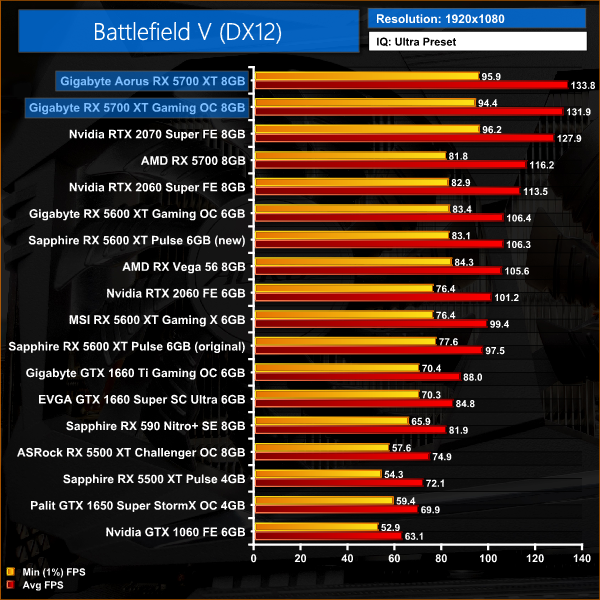 Battlefield V is our first game of the day, and here the performances gains for the Aorus card aren't huge. At 1080p, both 5700 XTs outperform the RTX 2070 Super, but the Aorus is just 1% faster than the Gigabyte Gaming OC.