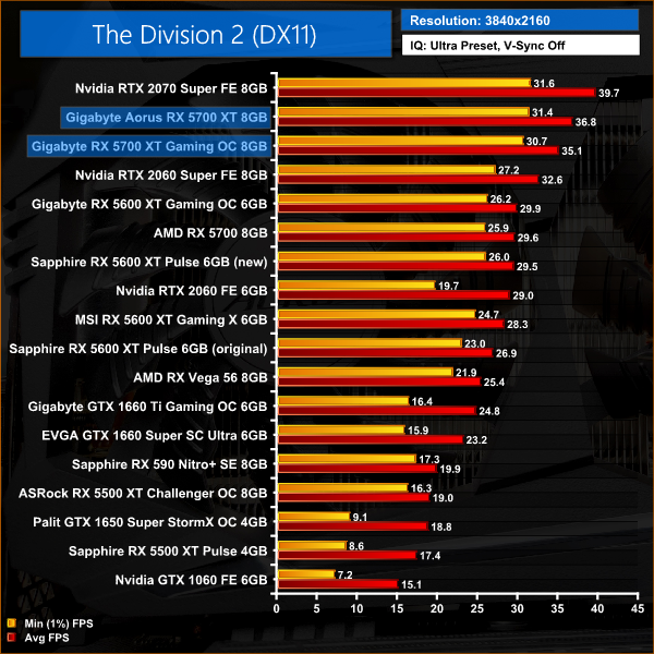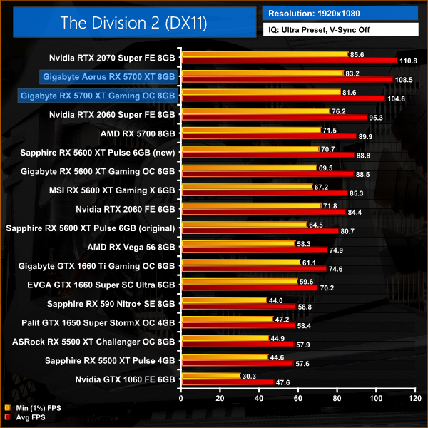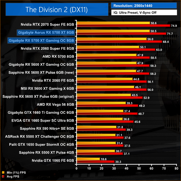 On the other hand, we see a reasonably significant difference between the two 5700 XTs in The Division 2. I've noted previously how this game responds strongly to an increase in clock speed and that certainly benefits the Aorus 5700 XT here – at 1080p, that card is 4% faster than the Gaming OC.