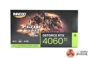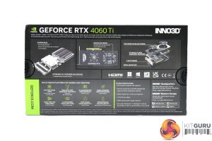 The Inno3D RTX 4060 Ti Twin X2 ships in a mostly black box, but with a large Twin X2 logo – along with some sort of robotic creature – visible on the front. On the back, Inno3D highlights various key features of the card and cooler design.