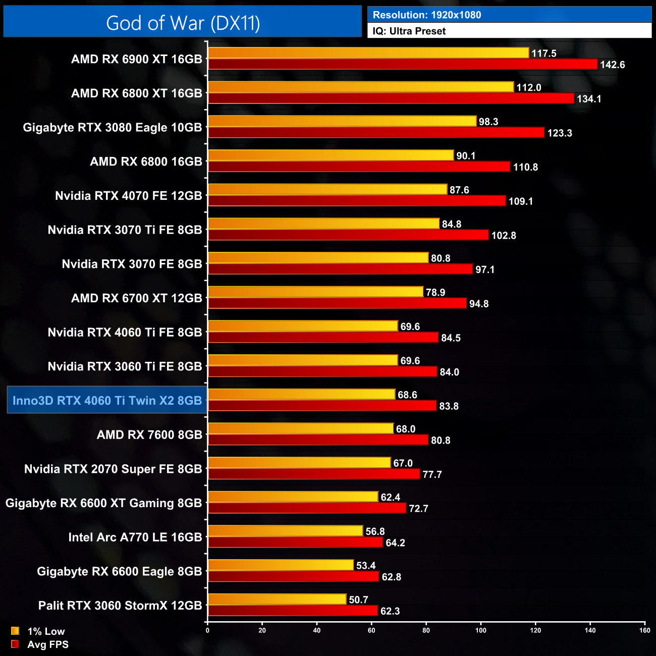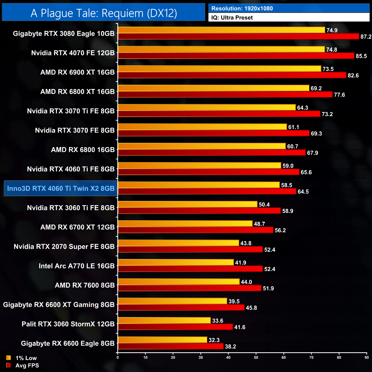We don't test as many games in our AIB card reviews as we would in our day 1 launch articles for reasons that should be pretty clear from viewing the above charts – the real-world gaming difference between two of the same GPUs is essentially nil. Our figures do show incredibly minor differences, with the Inno3D 1-2% behind the Founders Edition, but that's hardly even worth mentioning. In the real world, there'd be no telling these two cards apart based on gaming performance.