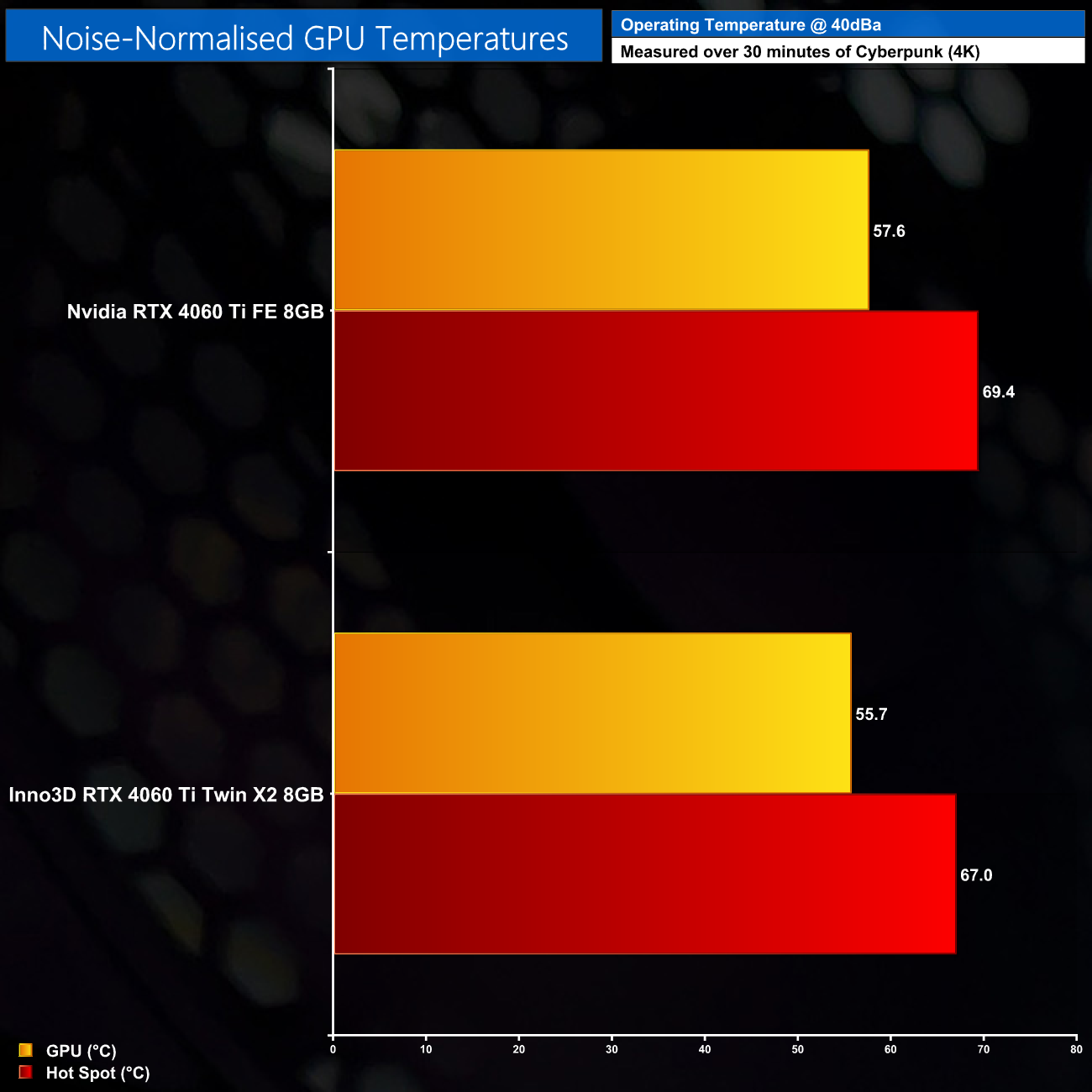Following on from our stock thermal and acoustic testing, here we re-test the operating temperature of the GPU, but with noise levels normalised to 40dBa. This allows us to measure the efficiency of the overall cooling solution as varying noise levels as a result of more aggressive fan curves are no longer a factor.