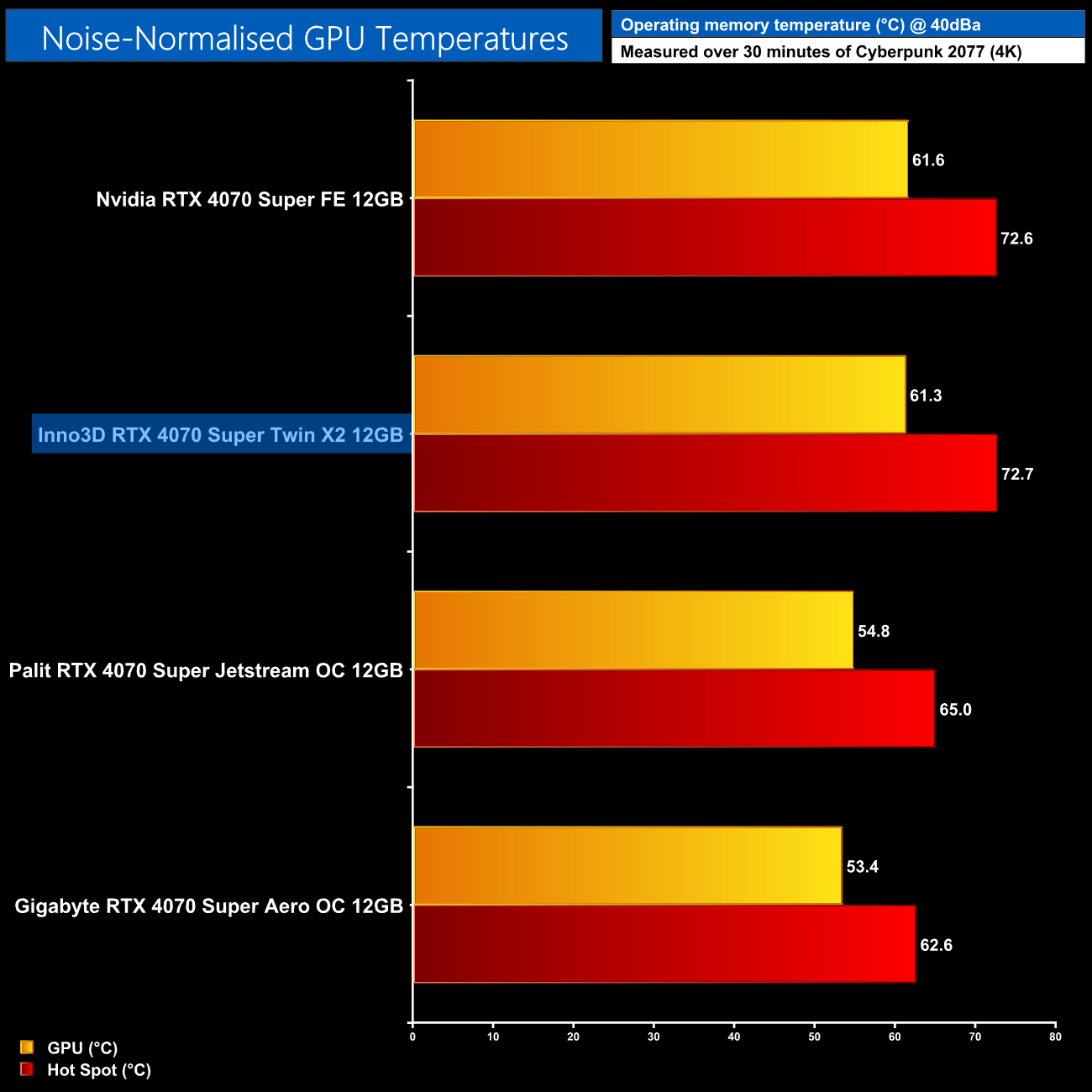 Following on from our stock thermal and acoustic testing, here we re-test the operating temperature of the GPU, but with noise levels normalised to 40dBa. This allows us to measure the efficiency of the overall cooling solution as varying noise levels as a result of more aggressive fan curves are no longer a factor.