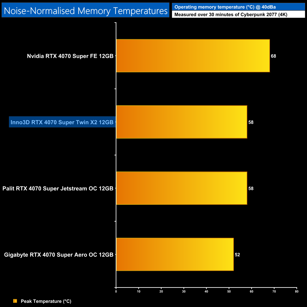 After normalising noise to 40dBa and re-running our thermal tests, we do see a bigger difference between the Twin X2 and the Aero OC and JetStream OC, but this is to be expected considering the size difference, and the fact the Twin X2 has one fewer fan than those triple-fan models. It's on-par with the Founders Edition though, so that's indicative of a good-quality cooler for the size.