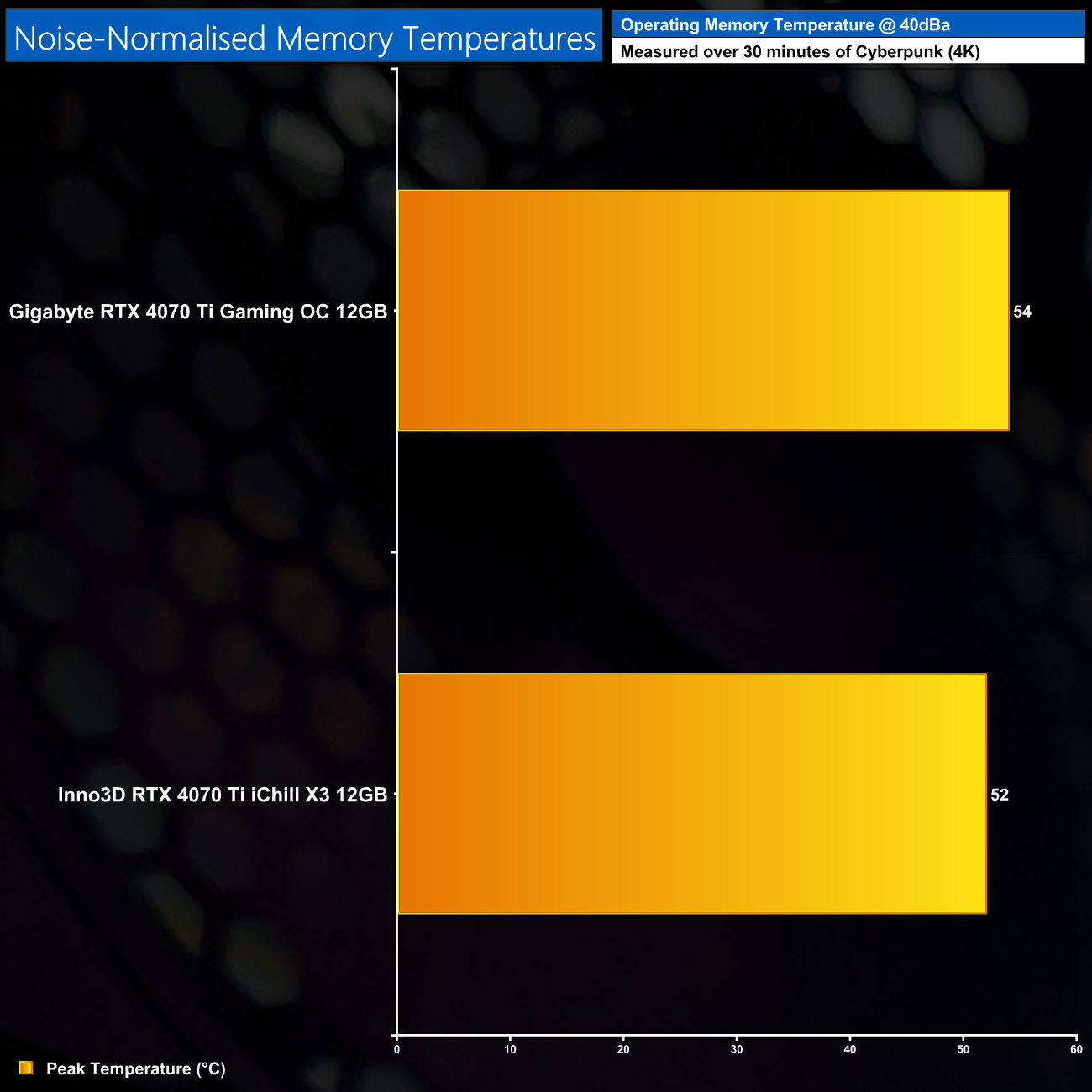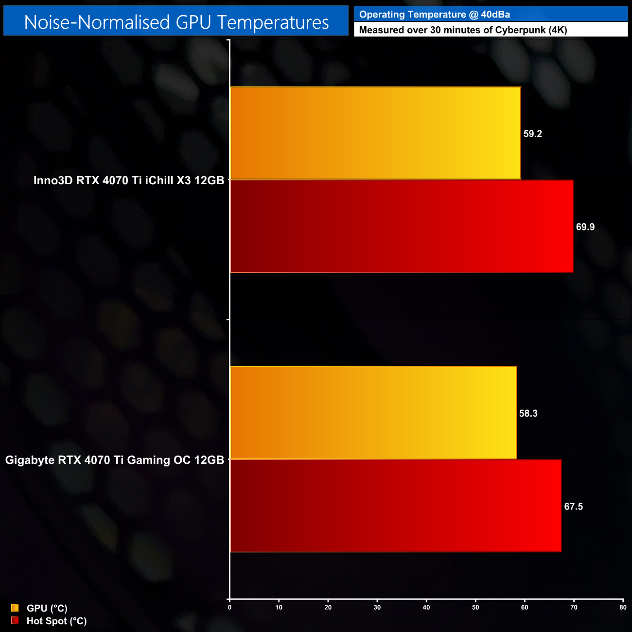 Following on from our stock thermal and acoustic testing, here we re-test the operating temperature of the GPU, but with noise levels normalised to 40dBa. This allows us to measure the efficiency of the overall cooling solution as varying noise levels as a result of more aggressive fan curves are no longer a factor.