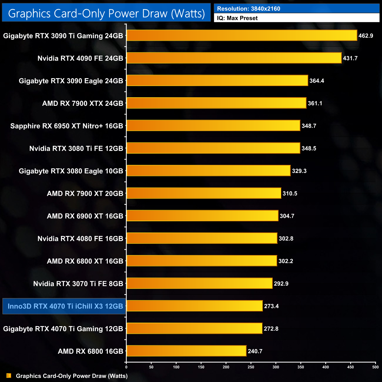 Despite a 320W TGP, actual power draw is much lower, averaging just over 273W, which is almost identical to the Gigabyte Gaming OC. We know the 4070 Ti more often voltage limited than it is power limited, so even with a higher power limit on the iChill X3, it doesn't really matter that much.