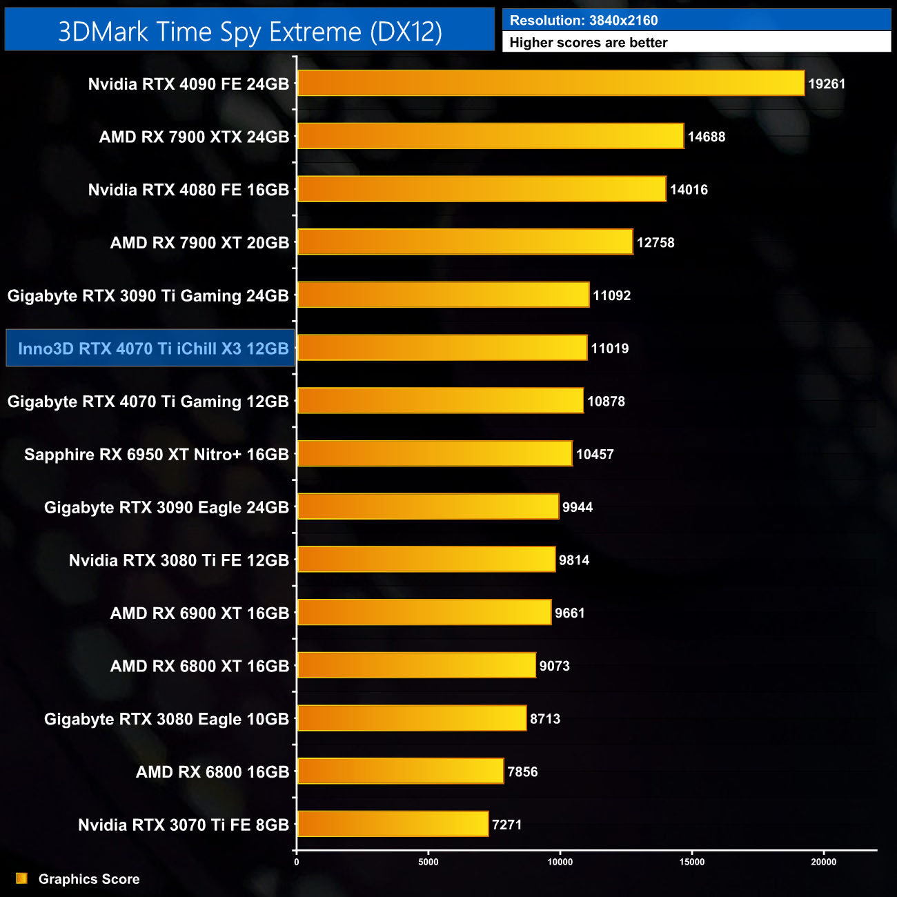For an initial look at 3DMark Time Spy Extreme, the iChill X3 performs as expected, delivering about 230 more points than the Gigabyte Gaming OC.